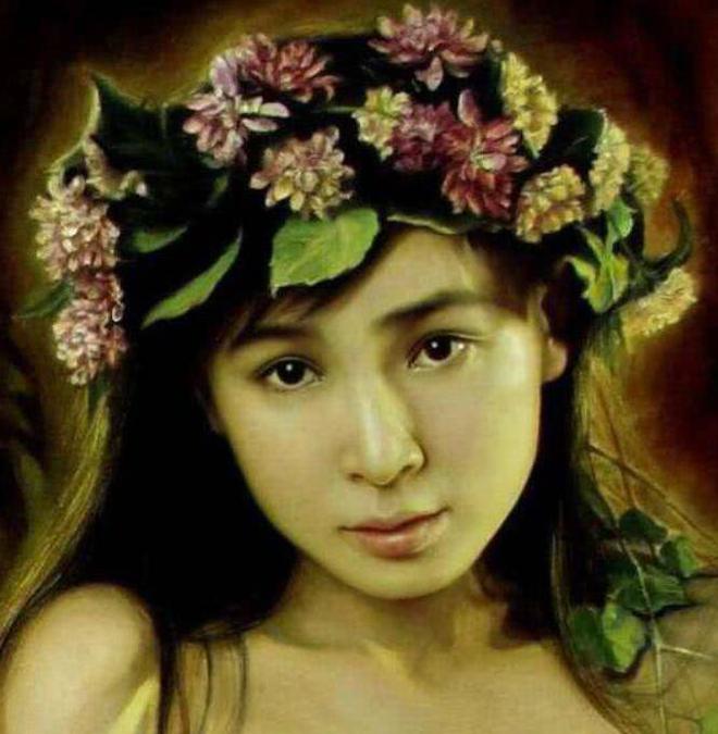 这幅油画是李壮平《东方神女山鬼系列》中的一幅,我们看到李勤头戴花冠,眼神好像在注视着什么,我们从李勤的眼神中看到了一种中华民族的坚强,从这些细节来看,也让我们近一步感受到了李壮平绘画功底的深厚,这样的绘画艺术一般人是达不到的,也正是因为李壮平对绘画艺术的理解比常人高,所以女儿选用女儿当画模创作出了《东方神女山鬼系列》,而这幅系列的画也是一夜爆红。