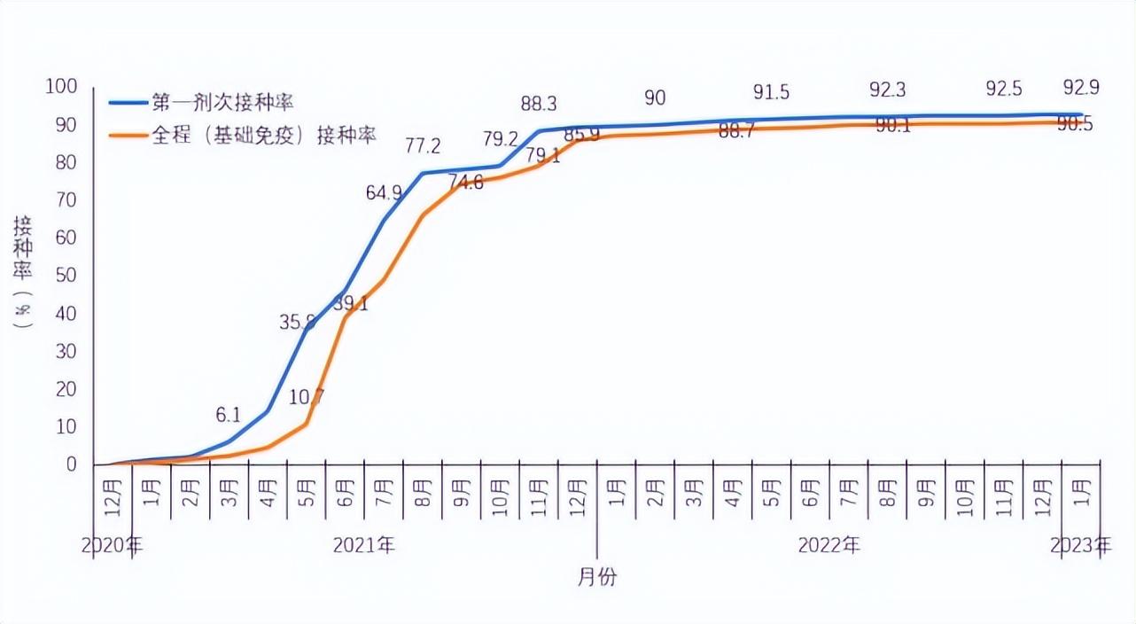 2020年12月15日全国启动新冠病毒疫苗大规模接种后,接种速度明显加快,5天完成1亿剂次接种,单日最高接种2474万剂次。我国积极稳妥推进接种工作,截至2023年1月20日,累计完成接种34.88亿剂次(图5-1)。全人群第一剂次、全程接种覆盖比例分别达到92.9%和90.5%(图5-2)。