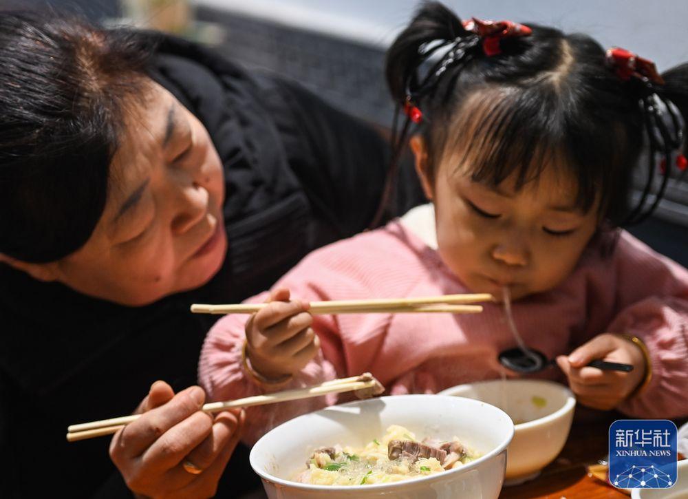 1月24日,在位于陕西省咸阳市的福园巷子街区,游客在一家商铺品尝臊子面。新华社记者 张博文 摄